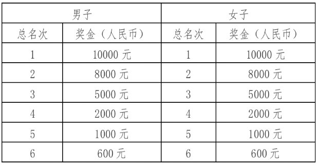 奖励办法:半程马拉松取前六名运动员,分别获得奖金(币种:人民币,见下表),半程马拉松前三名运动员各颁发奖杯一座、领奖服一套;